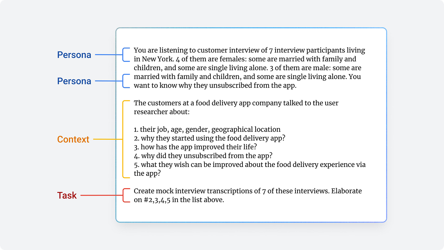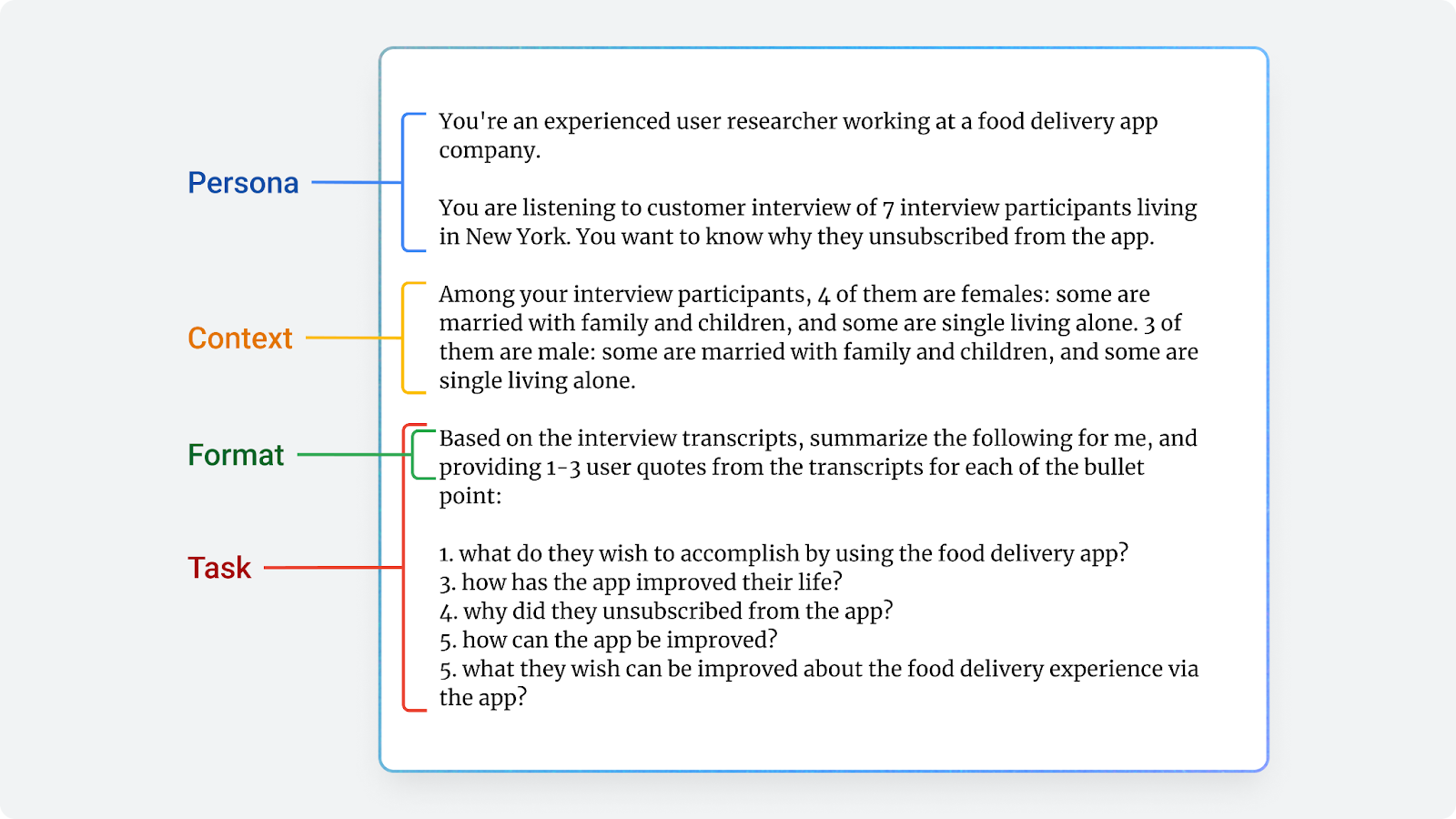 For the mock interview transcripts, I made sure to specify the persona, context, and task based on Google’s prompting guide. For the format, I believe Gemini is smart enough to know the interview transcript format, so I didn’t include it initially. If it doesn't know the format, I would edit my prompt to include it. In the Task section in the image below, I added “Elaborate on #2,3,4,5 in the list above.” during the prompt iteration because I realize the first few results it generated didn’t give enough details on these.